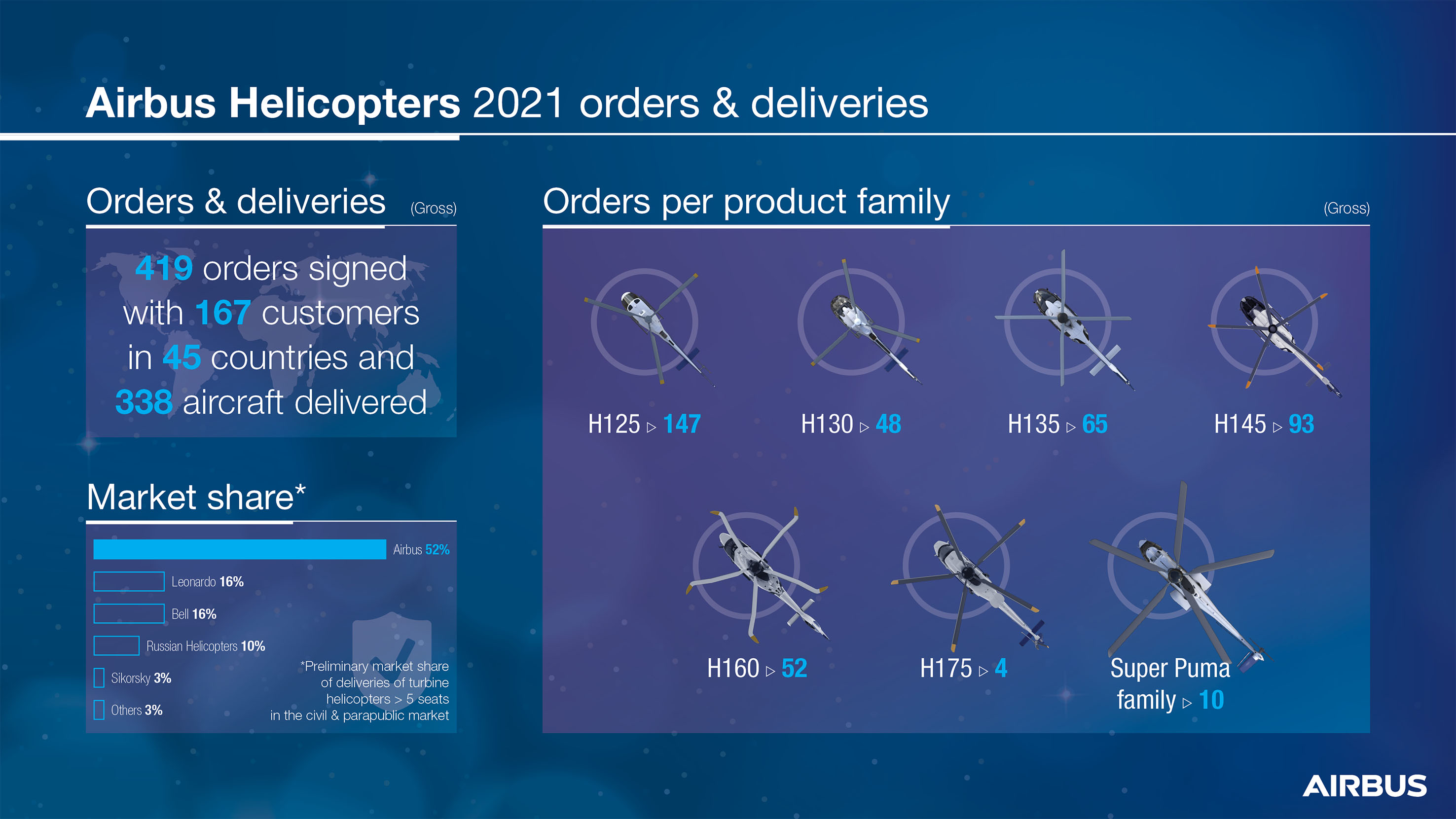 Marignane, 26 gennaio 2022 – Nel 2021, Airbus Helicopters ha registrato 419 ordini lordi (netti: 414) mostrando solidi segnali di ripresa dalla situazione di mercato del 2020, gravemente colpita dalle conseguenze economiche della pandemia di COVID-19. (2020 – 289 ordini lordi / 268 netti). L’incremento degli ordini di elicotteri leggeri, H125 e H130, riflette la ripresa del mercato civile e parapubblico. L’azienda ha registrato un forte slancio dai suoi paesi d’origine, con la Francia che ha ordinato 40 H160 (versioni civili e militari), otto H225M e due H145, la Spagna che ha ordinato 36 H135 e la Germania che ha acquistato otto H145 per le forze di polizia bavaresi. Le consegne sono aumentate da 300 nel 2020 a 338 nel 2021, contribuendo alla quota preliminare del 52% del mercato civile e parapubblico di Airbus Helicopters e confermando la sua posizione di leader di mercato. Nel numero di unità aeronautiche, Airbus Helicopters ha registrato un rapporto net book/fatturazione superiore a uno.