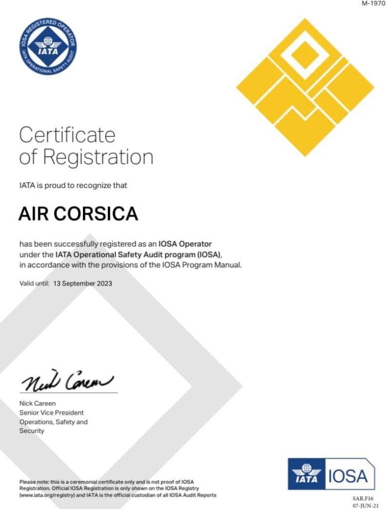 Il IATA Operational Safety Audit ha avuto esito positivo e quindi la certificazione IOSA a suo tempo accordata all’aerolinea francese Air Corsica e’ stata riconfermata con il certificato che riportiamo nella foto sopra.