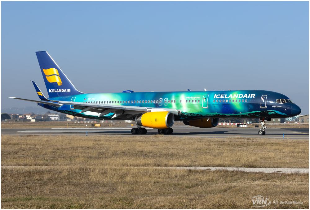 Icelandair che di solito garantisce ogni anno i voli, l’anno scorso non furono effettuati, utilizza un Boeing 757/200. La rotazione di oggi è stata operata dallo special color Hekla Aurora. La foto è di Monica De Guidi.