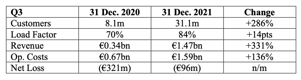 I ricavi programmati del terzo trimestre sono aumentati del 345% a 0,79 miliardi di euro, grazie a una forte ripresa del traffico da 8,1 milioni a 31,1 milioni di ospiti (con un fattore di carico dell’84%). Nonostante un buon inizio del terzo trimestre, in particolare la pausa di metà semestre della scuola a ottobre, la variante Omicron e il ritorno delle restrizioni di viaggio all’inizio di dicembre, hanno danneggiato in modo significativo (maggiore rendimento) le prenotazioni di Natale e Capodanno. Le tariffe medie nel terzo trimestre erano di soli € 25 (in calo del 24% rispetto allo stesso trimestre pre Covid). Le entrate accessorie hanno prodotto una solida performance, generando € 22 per passeggero (+8%), poiché gli ospiti scelgono l’imbarco prioritario e il posto riservato. I ricavi totali sono aumentati di oltre il 330% a 1,47 miliardi di euro nel terzo trimestre.