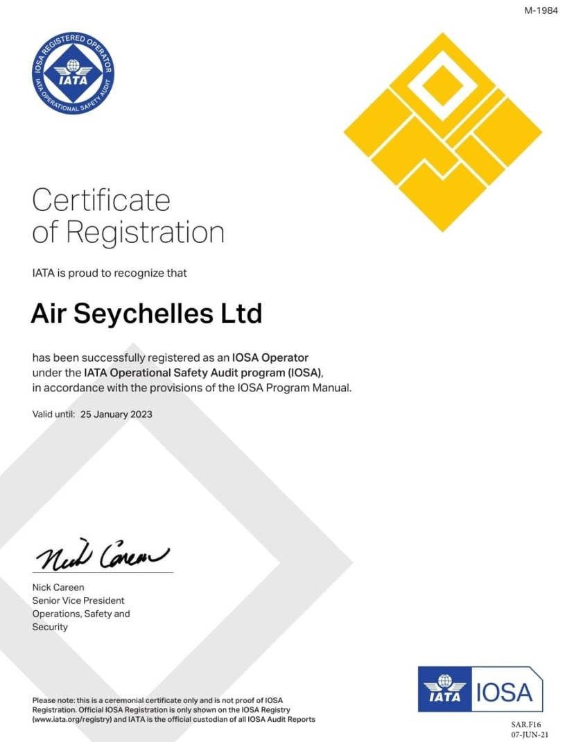 Air Seychelles per continuare a mantenere la IOSA sta operando in armonia dei dettami del IOSA Program Manual.