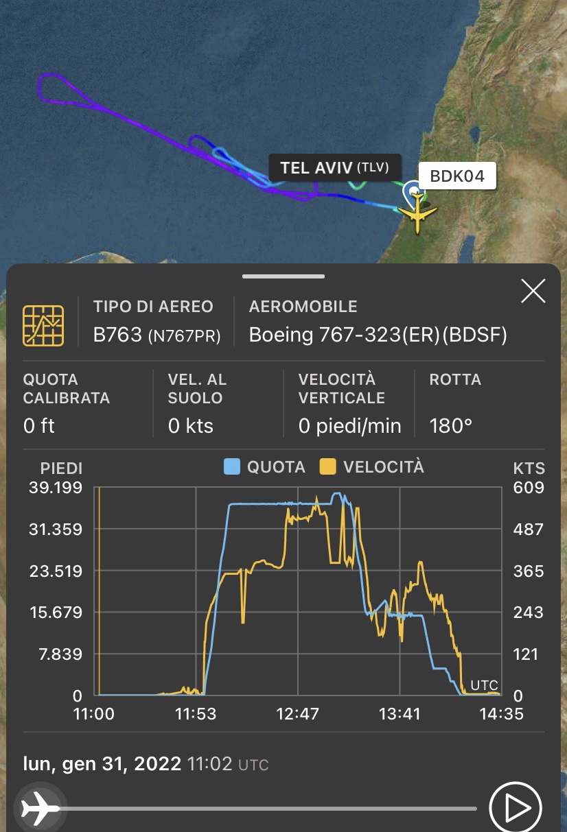 Dopo vari ritardi sulla partenza da Tel Aviv, con il codice chiamata radio della matricola N767PR è partito dalla città israeliana alle 21:28 per poi atterrare alle 01:58. Quindi ha sostato fino alle 14:21 per poi volare via.