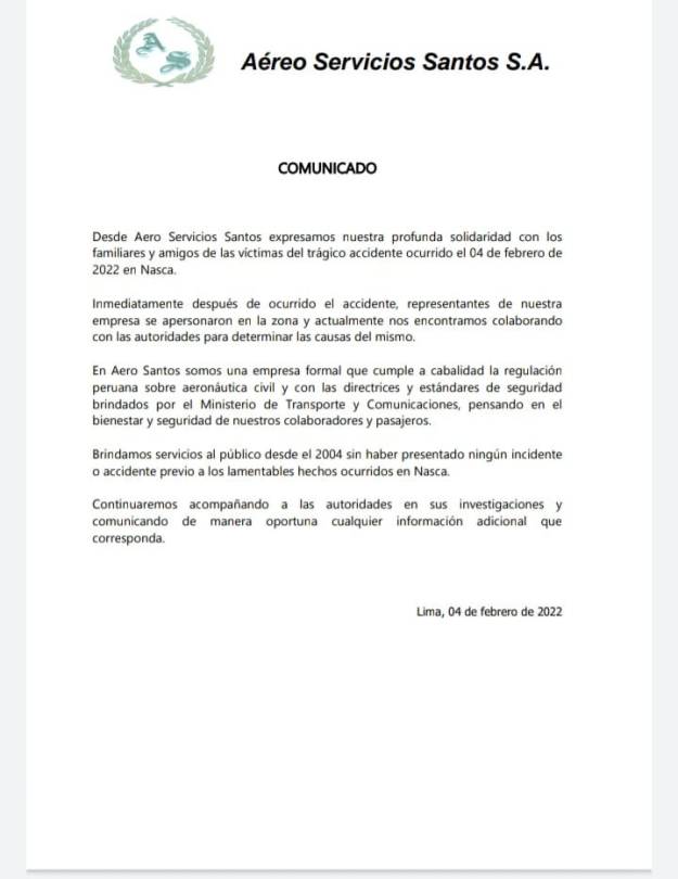 Il volo operato da un Cessna 207 è partito dall’Aeropuerto Maria Reiche Newman a Nazca, in Perù, e avrebbe visto le famose linee di Nazca vicine. Non c’erano sopravvissuti.