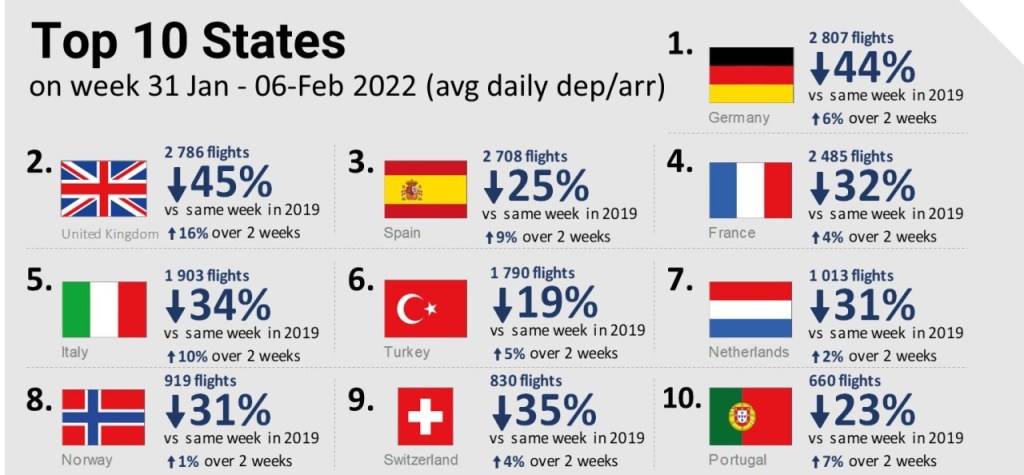Le statistiche di Eurocontrol uscite meno di una mezzoretta fa, danno questo quadro nei 10 paesi europei copn maggior traffico. Nelle cifre in carattere minuscolo ci sono le variazioni occorse nelle ultime due settimane, prendendo esempio della settimana tra il 31 gennaio e il 6 febbraio 2022.