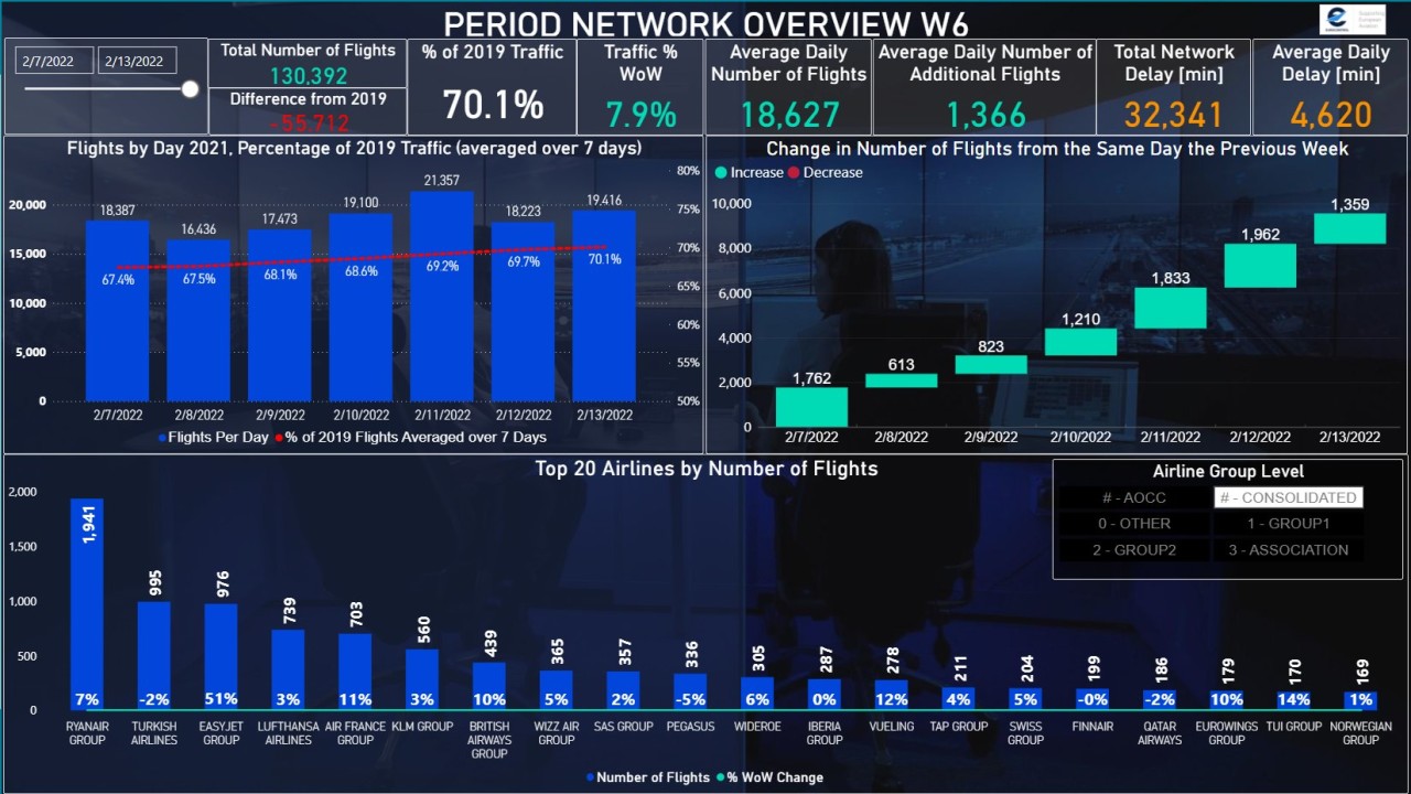 Tra le aerolinee la Ryanair ha operato una media di 1941 voli al giorno con un più 7% sulla settmana precedente. easyjet sale a 976 voli al giorno di media con un più 51%. vueling cresce del 12% e Wizz del 5%.
