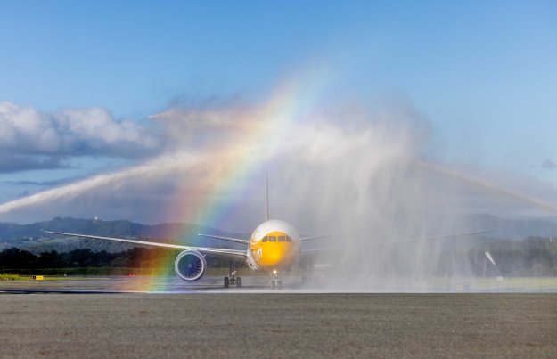Un water canno salute ha celebrato l’arrivo del bireattore nel collegamento diretto da Singapore.