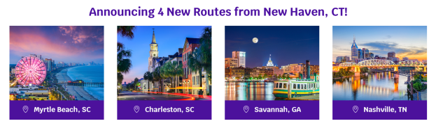 A partire da maggio, Avelo aggiungerà un servizio non-stop esclusivo tra HVN e due destinazioni della Carolina del Sud: Myrtle Beach e Charleston, nonché Savannah, Ga. / Hilton Head, S.C.; e Nashville, Tennessee.