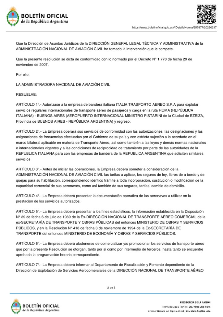 Con il dispositivo nr. Resolucion 51 / 2022 RESOL-2022-51-APN-ANAC#APR del 14/2/2022 pubblicato sul Boletin Oficial de la Republica Argentina, la compagnia aerea ITA Airways ha avuto la formale approvazione affinche in futuro attivi i voli di linea tra l’Argentina e l’Italia.