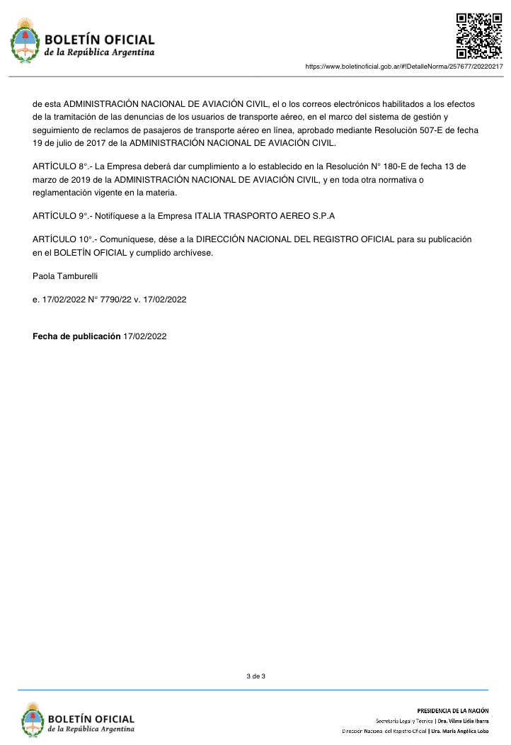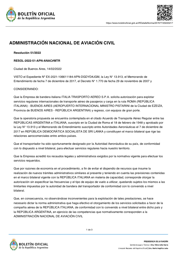 Con il dispositivo nr. Resolucion 51 / 2022 RESOL-2022-51-APN-ANAC#APR del 14/2/2022 pubblicato sul Boletin Oficial de la Republica Argentina, la compagnia aerea ITA Airways ha avuto la formale approvazione affinche in futuro attivi i voli di linea tra l’Argentina e l’Italia.