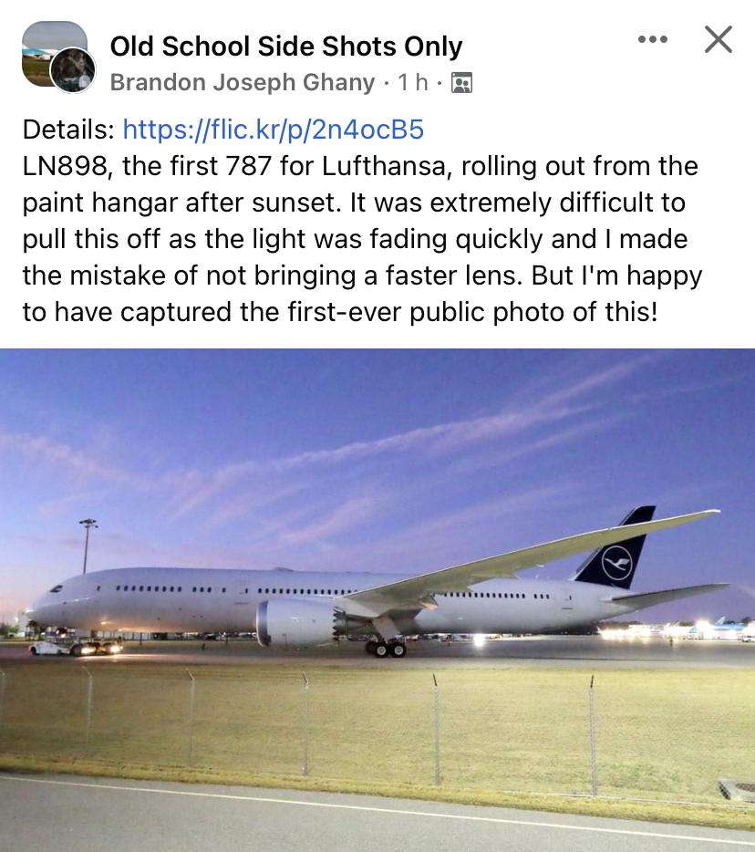 Il primo B787-9 per Lufthansa, ln 898 e registrazione D-ABPE a essere apparso quest’oggi negli USA fuori dalla linea di produzione. L’immagine e’ stata pubblicata oltreche su Flickr anche su un gruppo di spotters.