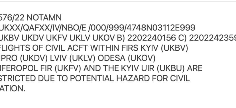 Questo e’ il NOTAM emesso dove le FIR ucraine di Kiev, Lviv, Dnipro, Odessa e Simferopol , oltre alla UIR di Kiev sono restricted per il potenziale rischio per l’aviazione civile a causa della situazione di guerra esistente da stamani alle 5 in ora di Kiev.