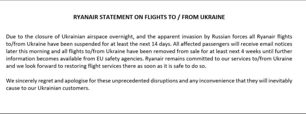 Ryanair, la quale fino a ieri era stata attivissima sui voli da e per l’Ucraina, oggi anche lei ha comunicato alla clientela di aver sospeso tutti i voli previsti a causa del conflitto in essere dalle prime ore di oggi con l’attacco militare effettuato dalla Russia.