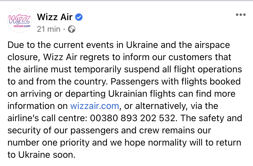 L’attacco russo, ha colto di sorpresa la Wizzair con quattro aerei fermi in Ucraina. In totale sono quattro gli aerei del vettore low cost magiaro.