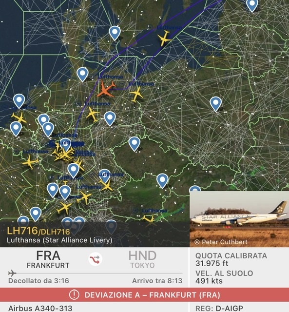 Diversamente il volo LH716 da Francoforte verso Tokyo Haneda sull’Estonia ha invertito la rotta.