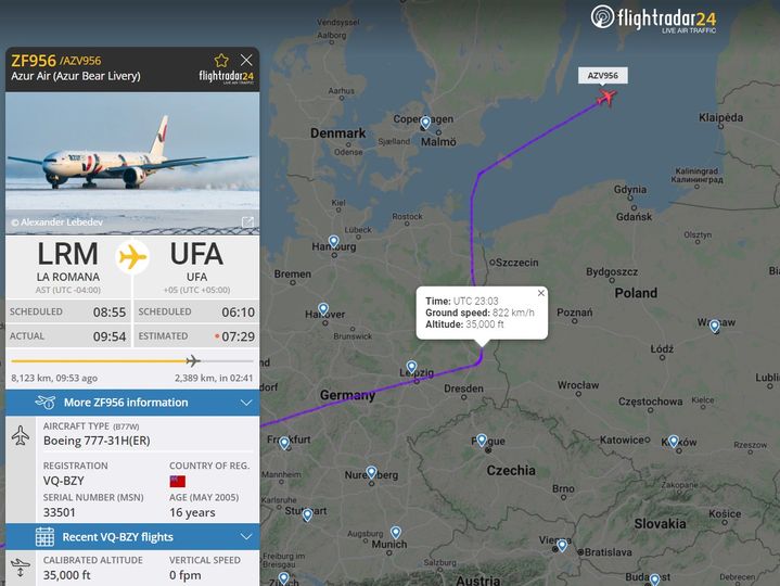 Questo B777-300ER della Azur Air deve “saltare” la Polonia nel suo viaggio da La Romana a Ufa, perchè la polonia ha chiuso la possibilità di sorvolo ai voli russi.