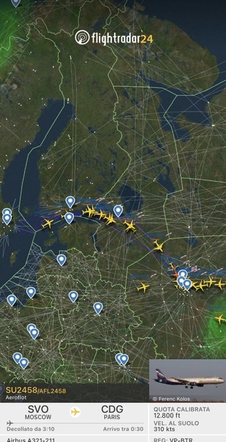 Il volo per Parigi era gia’ arrivato sul Mar Baltico alla confluenza con il Golfo di Botnia, quello per Bruxelles ha fatto marcia indietro difronte a Helsinki e Tallinn.