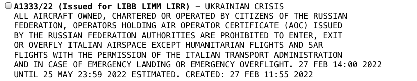 A partire dalle 15 locali, come abbiamo gia’ anticipato lo spazio aereo italiano sara’ chiuso a tutto cio’ che e’ russo in forza di questo NOTAM A1333/22 emesso alle 1155UTC, le 1255 locali.