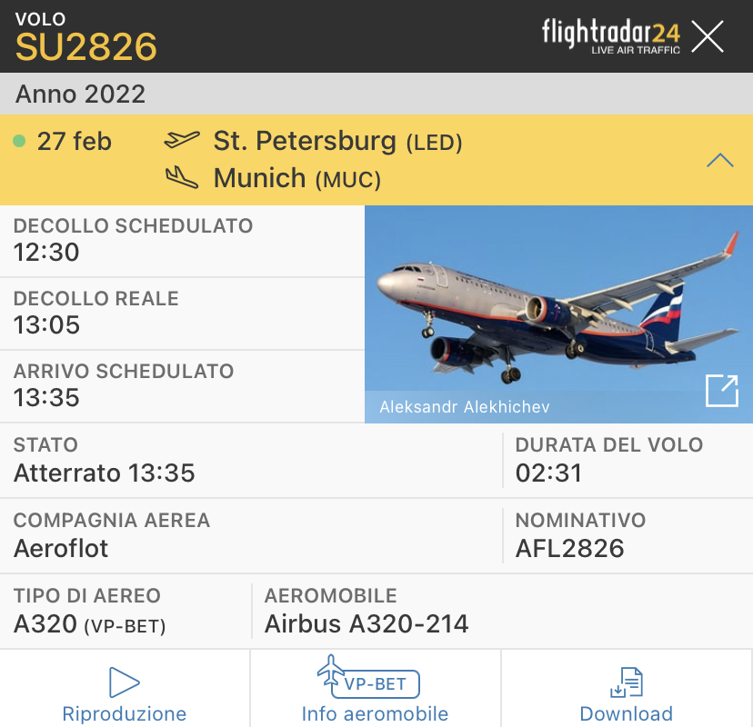 E’ il volo SU2826 tra San Pietroburgo e Monaco atterrato alle 1335 di ieri e tuttora fermo.