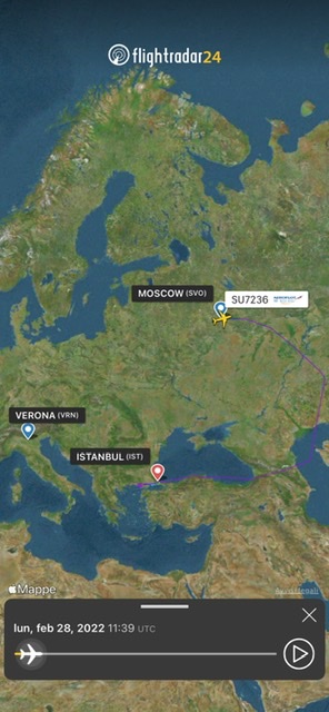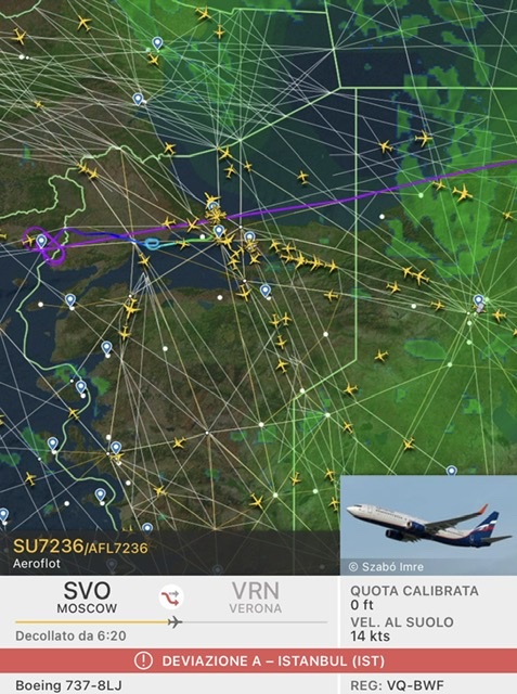 compagnie aeree Aeroflot : un Mosca – Verona fermato dai greci e atterrato poi a Istanbul Pubblicato da Italiavola il 28 febbraio 2022 Questo B737-8LJ VQ-BWF e’ decollato oggi da Mosca con destinazione Verona, ma all’ingresso dello spazio aereo greco e’ stato fermato ed e’ atterrato a Istanbul dopo 6 ore e 20 minuti di volo. Condividi: Fai clic per condividere su Facebook (Si apre in una nuova finestra) Facebook Fai clic qui per condividere su LinkedIn (Si apre in una nuova finestra) LinkedIn Fai clic qui per condividere su Reddit (Si apre in una nuova finestra) Reddit Fai clic qui per condividere su Pinterest (Si apre in una nuova finestra) Pinterest Fai clic qui per condividere su Tumblr (Si apre in una nuova finestra) Tumblr Fai clic per condividere su X (Si apre in una nuova finestra) X Mi piace Caricamento... Correlati