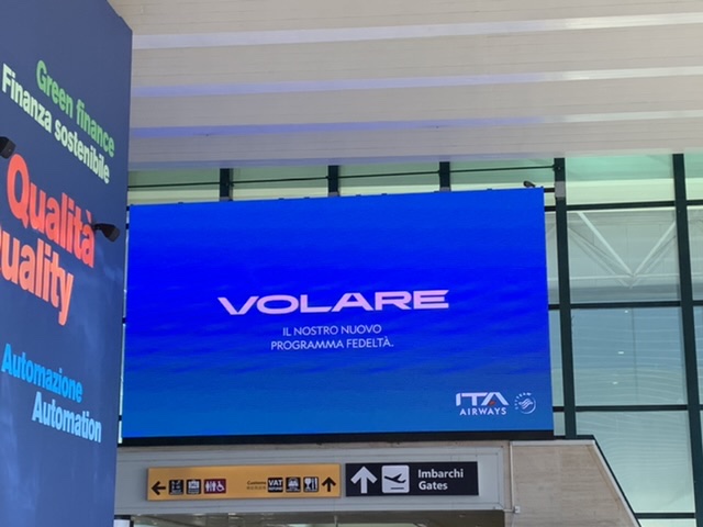 La pubblicità a Roma Fiumicino sul nuovo programma Volare di ITA Airways.