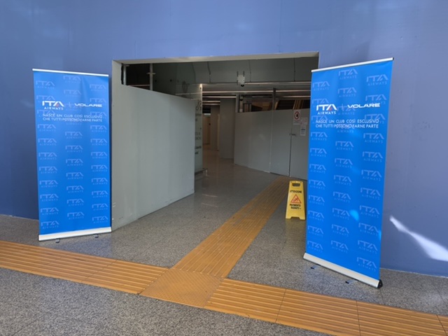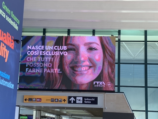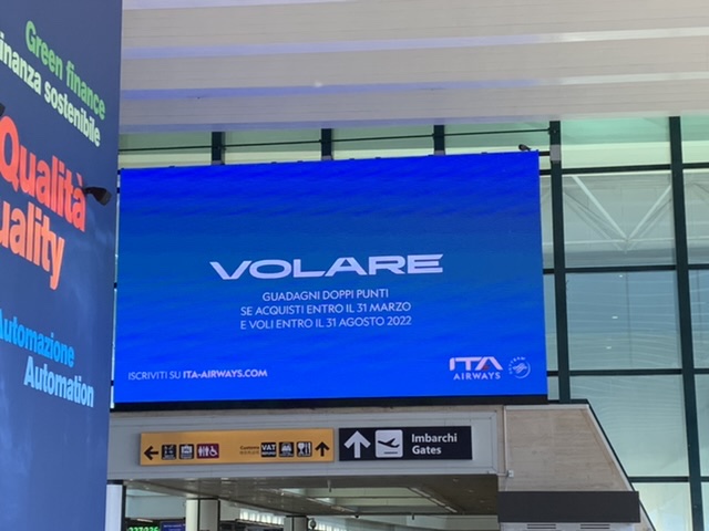 La pubblicità a Roma Fiumicino sul nuovo programma Volare di ITA Airways.