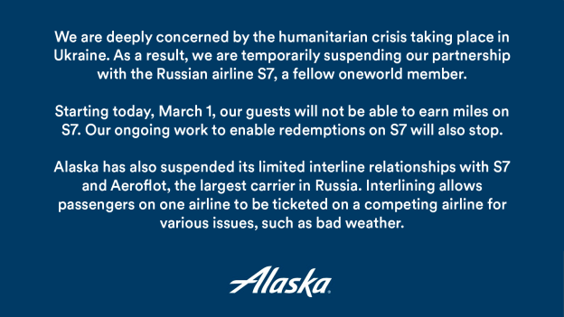 Alaska Airlines ha comunicato al mercato, che alla luce della situazione attuale per gli eventi in essere tra Russia e Ucraina, la partnership in essere per l’accumulo e l’uso di miglia con S7 Airlines è stata sospesa.