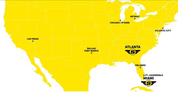 Le nuove basi integreranno le esistenti basi dell’equipaggio di Spirit ad Atlantic City (ACY), Chicago (ORD), Dallas (DFW), Detroit (DTW), Fort Lauderdale (FLL), Las Vegas (LAS) e Orlando (MCO).