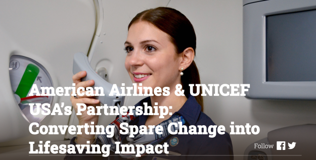 Il programma UNICEF Change for Good è un’alleanza tra l’UNICEF e l’industria aerea internazionale per convertire gli spiccioli donati dai clienti che viaggiano in aereo in servizi e forniture essenziali per i bambini vulnerabili in tutto il mondo. Da quando la loro collaborazione è iniziata nel 1994, gli assistenti di volo di American hanno contribuito a raccogliere oltre 17 milioni di dollari per sostenere l’UNICEF e i suoi sforzi umanitari in tutto il mondo.
