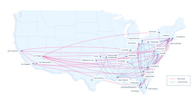 L’espansione include anche rotte a lungo raggio come Providence-Los Angeles, Syracuse-Las Vegas e Charleston-San Francisco. La compagnia aerea diventerà anche la prima compagnia aerea passeggeri a volare dall’aeroporto internazionale di San Bernardino (vicino a Ontario, CA).