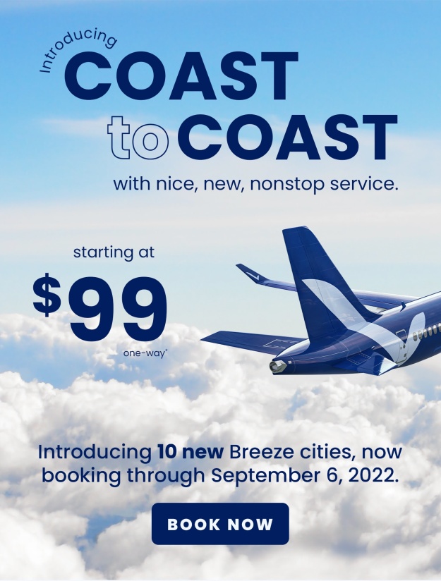 Breeze Airways ha annunciato oggi l’aggiunta di voli in 10 nuove città tra cui Las Vegas, Los Angeles, San Francisco, Nashville e Jacksonville, e il potenziamento del servizio in altre, tra cui Charleston e Hartford/Springfield.