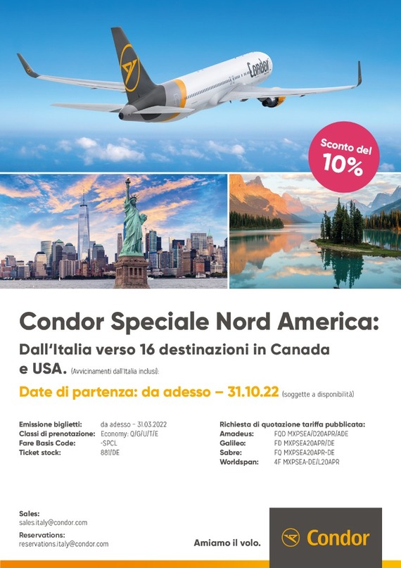 compagnie aeree CONDOR – SPECIALE NORD AMERICA 10% SCONTO – Marzo 2022 Pubblicato da Italiavola il 9 marzo 2022 La Condor ti permette di farti raggiungere 16 destinazioni in Nord America. Ora c’è il 10% di sconto per partenze da adesso al 31 ottobre 2022. Condividi: Fai clic per condividere su Facebook (Si apre in una nuova finestra) Facebook Fai clic qui per condividere su LinkedIn (Si apre in una nuova finestra) LinkedIn Fai clic qui per condividere su Reddit (Si apre in una nuova finestra) Reddit Fai clic qui per condividere su Pinterest (Si apre in una nuova finestra) Pinterest Fai clic qui per condividere su Tumblr (Si apre in una nuova finestra) Tumblr Fai clic per condividere su X (Si apre in una nuova finestra) X Mi piace Caricamento... Correlati