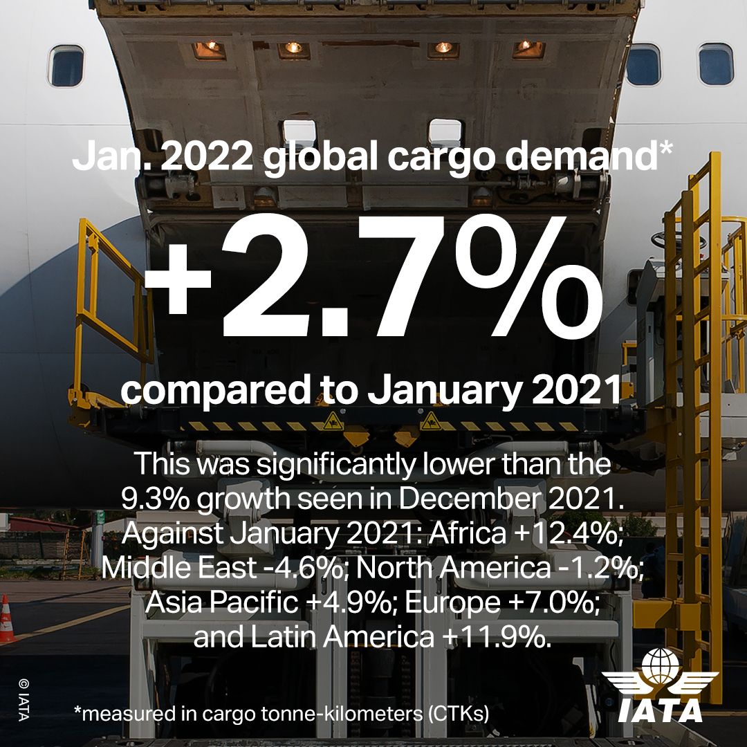 La domanda globale, misurata in tonnellate-chilometro cargo (CTK*), è aumentata del 2,7% rispetto a gennaio 2021 (3,2% per le operazioni internazionali). Questo è stato significativamente inferiore alla crescita del 9,3% vista a dicembre 2021 (1% per le operazioni internazionali).