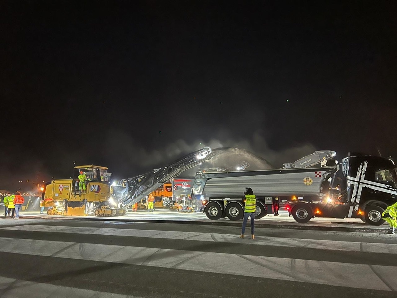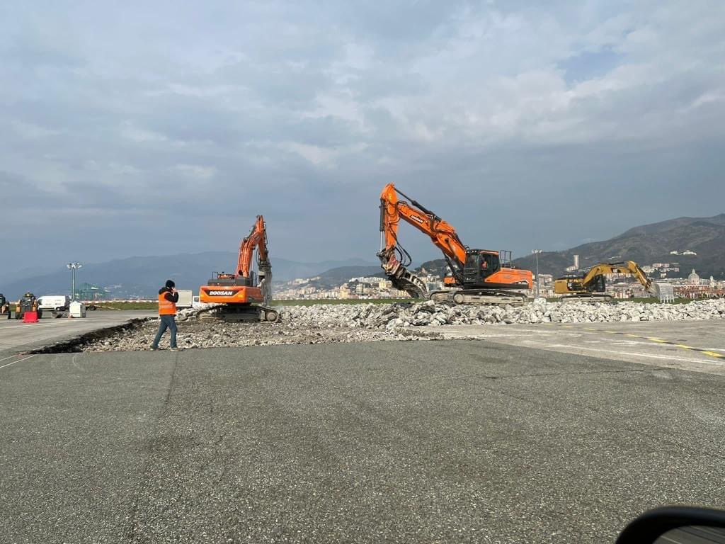 E’ un lavoro continuo su piu’ turni, giorno e notte, cosi a Genova si sta riqualificando la pista di volo.