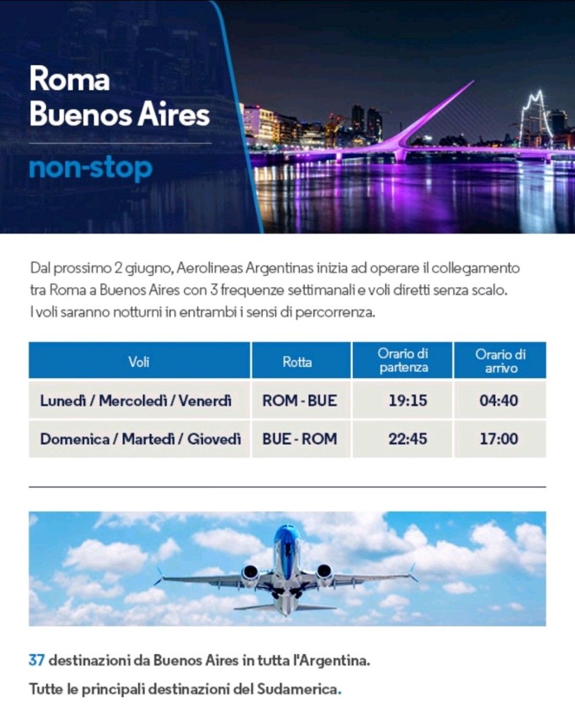 Questa notizia ci riempie di allegria poiché’ significa tornare ad operare un collegamento storico dell’offerta di Aerolineas. Roma è una destinazione unita al nostro paese per grandissimi vincoli culturali e storici. È una rotta che inoltre serve per continuare ad ampliare l’offerta per il turismo ricettivo che, come sappiamo, è fondamentale per lo sviluppo economico di tutto il settore”,ha dichiarato Pablo Ceriani, presidente di Aerolíneas Argentinas.