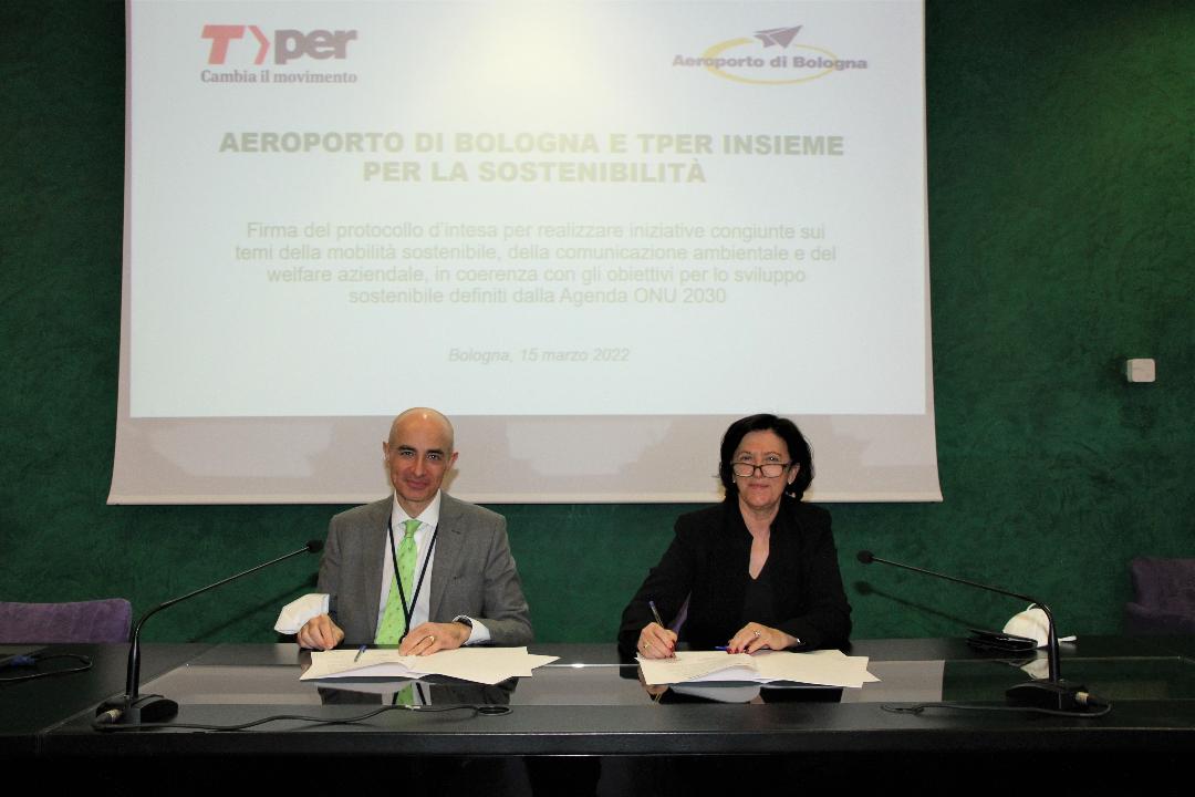 L’amministratore delegato e direttore generale di Aeroporto di Bologna Nazareno Ventola e lapresidente e amministratore delegato di Tper Giuseppina Gualtieri hanno firmato oggi un protocollo d’intesa di durata triennale percollaborare su progetti indirizzati alla mobilità sostenibile, alla comunicazione ambientale e al welfare aziendale, in coerenza con gli obiettivi definiti dalla Agenda ONU 2030.