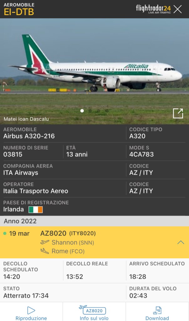 Questo pomeriggio a Roma Fiumicino e’ giunto da Shannon l’A320-216 ITA Airways EI-DTB. Il numero di volo AZ/ITY8020.