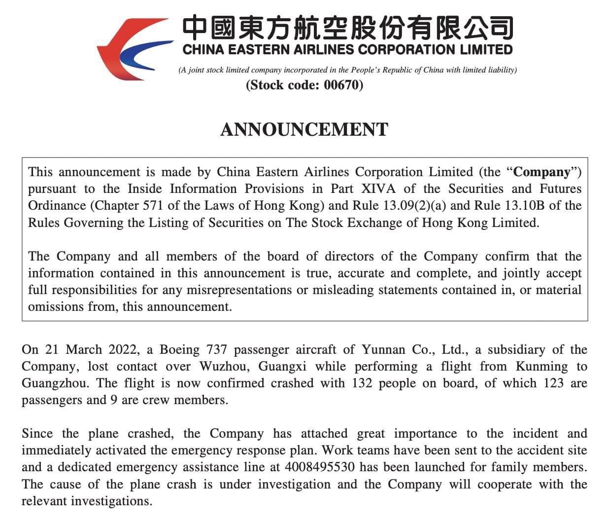La compagnia cinese China Eastern , a seguito dell’incidente accaduto ieri a un Boeing 737/800, ha deciso la messa a terra di tutti i velivoli di questo tipo. 106velivoli di questo tipo sono attualmente in servizio, la decisione e’ stata autonoma, infatti la CAAC non ha emesso alcun provvedimento cautelativo e restrittivo sul tipo di aeromobile.