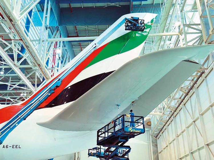 Dall’inizio del 2016 Emirates utilizza una tecnica di lavaggio a secco per pulire la sua flotta di oltre 250 aeromobili: un detergente liquido viene prima applicato manualmente sull’intera superficie esterna dell’aereo; un tessuto in microfibra pulito viene utilizzato per rimuovere il prodotto detergente che si è asciugato fino a formare una pellicola, eliminando lo sporco e lasciando l’aeromobile pulito e lucidato. La sottile pellicola protettiva consente alla superficie verniciata di mantenere lucentezza e un tono brillante più a lungo. Un equipaggio di 15 persone impiega circa 12 ore per pulire un A380 e circa 9 ore per pulire un Boeing 777.