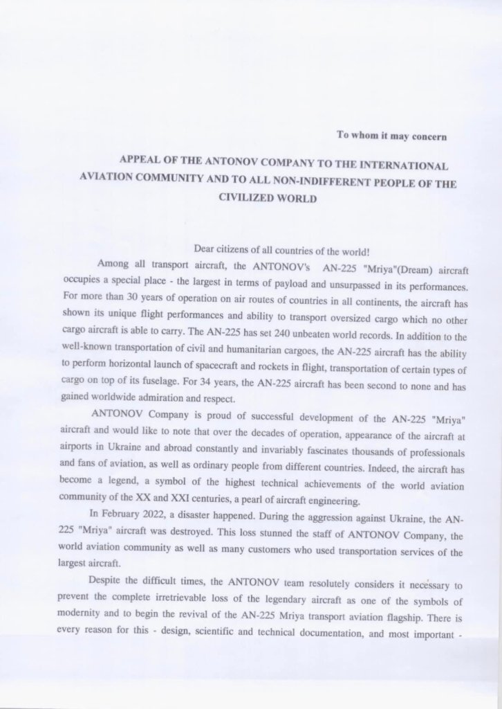 La compagnia ANTONOV spera in un potente supporto del progetto di revival dell’aereo AN-225 “Mriya” ed esprime la sua più grande gratitudine e comprensione per il fatto che il progetto mira a ripristinare l’aereo come simbolo dei più alti risultati scientifici e tecnologici del mondo nella costruzione di aeromobili moderni .