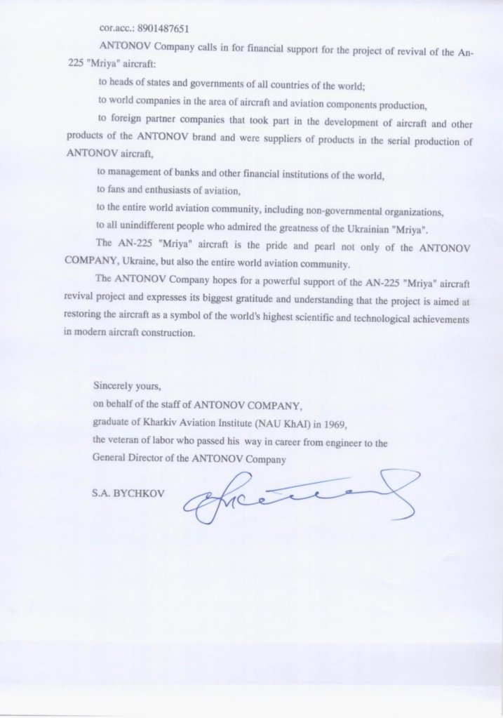 Nonostante i tempi difficili, il team ANTONOV ritiene risolutamente necessario prevenire la completa irrimediabile perdita del leggendario velivolo come uno dei simboli della modernità e iniziare il revival dell’ammiraglia dell’aviazione da trasporto AN-225 Mriya. Ci sono tutte le ragioni per questo – progettazione, documentazione scientifica e tecnica e, soprattutto – disponibilità, grande desiderio e ispirazione del team di ANTONOV. Sfortunatamente, in un momento difficile per l’Ucraina e la società ANTONOV, non ci sono abbastanza soldi per risolvere questo problema.