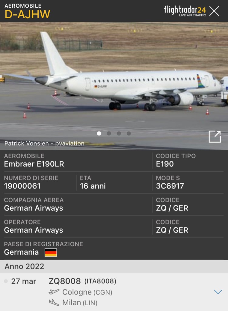 Come ZQITA8008 questa sera da Colonia e’ arrivato a Milano Linate l’E190LR D-AJHW della German Airways.
