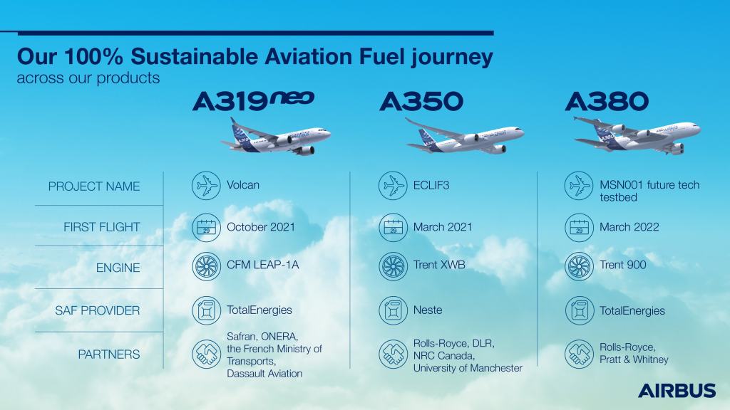 Questo è il terzo tipo di aeromobile Airbus a volare con il 100% SAF nel corso di 12 mesi; il primo è stato un Airbus A350 nel marzo 2021 seguito da un aeromobile a corridoio singolo A319neo nell’ottobre 2021.