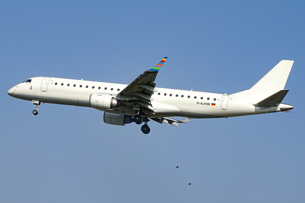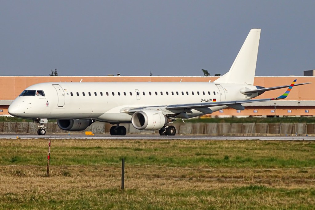 Tutto bianco, nessun titolo o piccolo sticker è presente su questo Embraer E190LR D-AJHW della German Airwyas, del quale abbiamo notiziato ieri del suo arrivo da Colonia e della partenza stamani del primo volo da Milano Linate per London City in ACMI per ITA Airways.