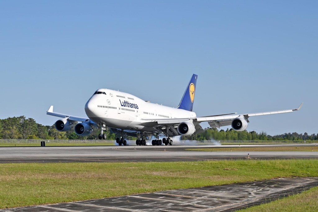 Nella foto e’ visibile il Boeing 747-400 al momento del contatto con il terreno delle ruote dei carrelli di atterraggio.