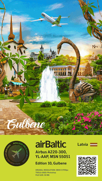 Il decimo numero di airBaltic è un’opera d’arte digitale con una delle città lettoni più amate Gulbene, circondata dalla leggendaria ferrovia a scartamento ridotto, dallo storico castello di Stāmeriena e dal simbolo della città: la scultura del cigno. In onore del centenario della Lettonia, nel 2018, airBaltic ha invitato tutti a votare le loro città e paesi preferiti in Lettonia, da cui è stata intitolata la flotta di Airbus A220-300 della compagnia.