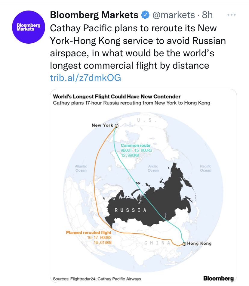 Cathay Pacific Airways sta pianificando di reindirizzare la rotta a lunga distanza Hong Kong – New York (JFK) per evitare lo spazio aereo russo.