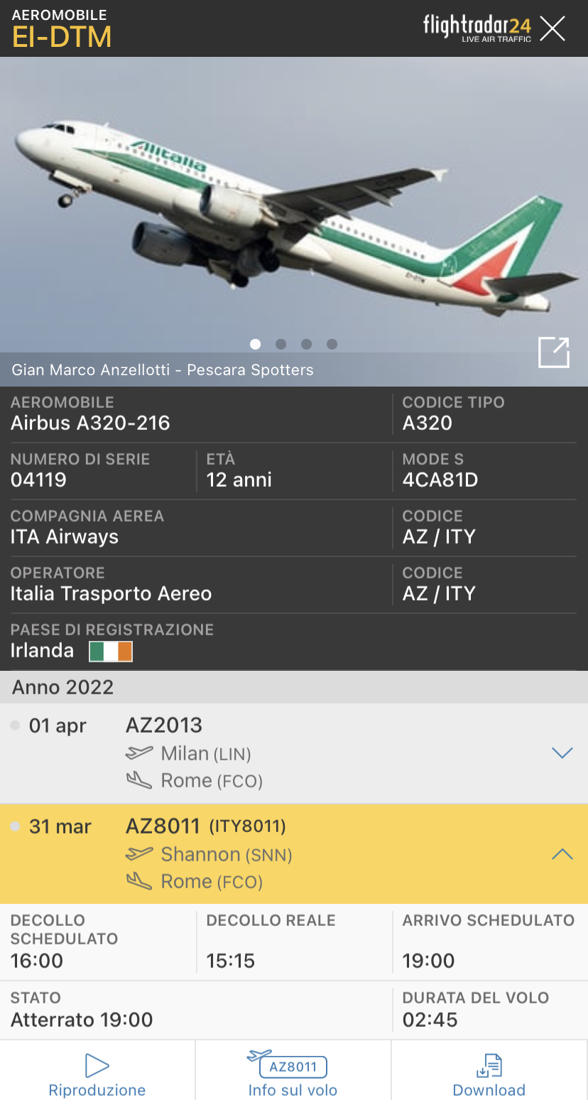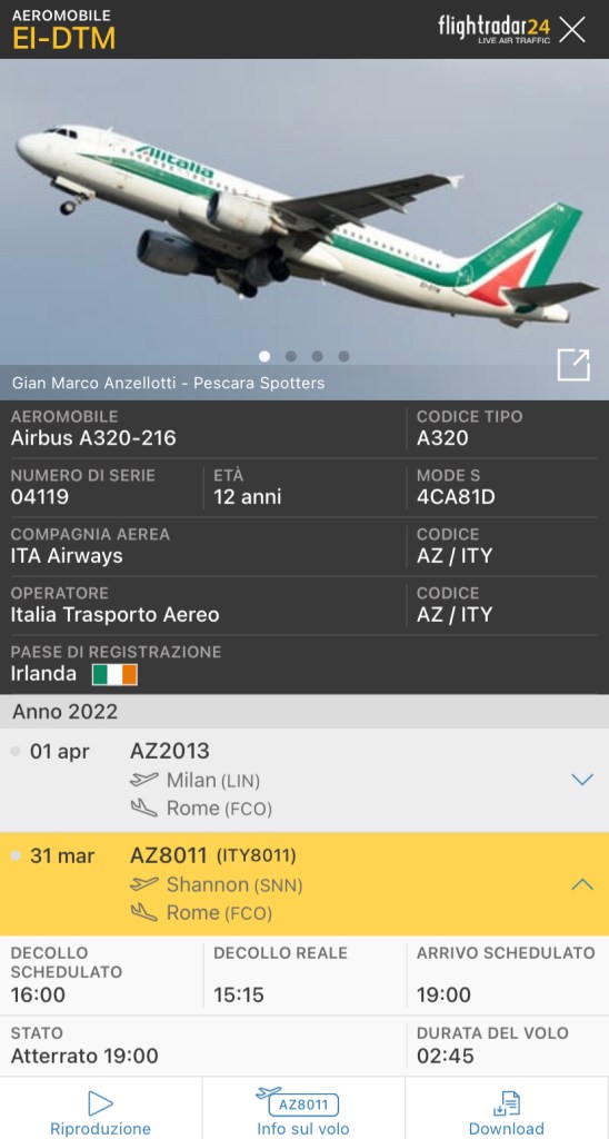 Questa sera e’ giunto da Shannon a Roma Fiumicino come AZ8011.