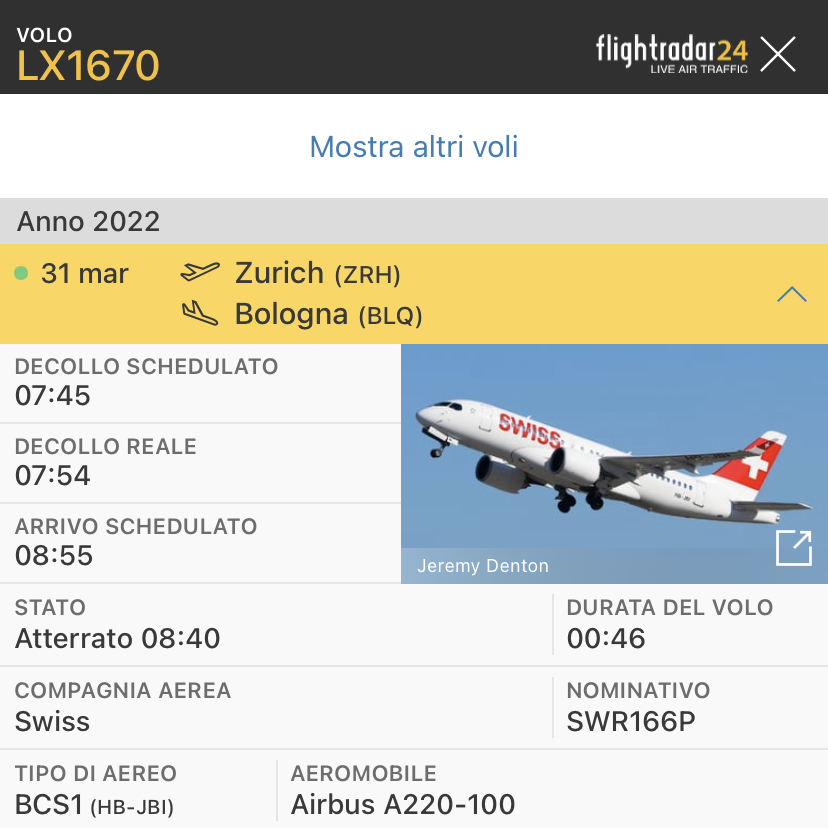 L’Airbus 220-100 HB-JBI ha effettuato la prima rotazione. In questa stagione IATA saranno quattro i voli previsti ogni settimana. All’annuncio era stato indicato l’Embraer 190 E-2 come tipo di velivolo, oggi e la prossima rotazione saranno effettuati con l’A220-100 che significano un 23% di offerta di posti in piu’.
