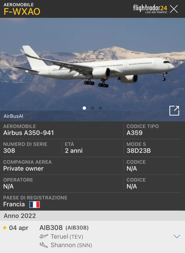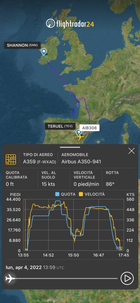 Da bianco come un lenzuolo a azzurro nella livrea ITA Airways. Questo A350-941 era in storage a Teruel in Spagna e ha effettuato un volo di verifica/trasferimento in Irlanda alla IAC – International Aerospace Coatings. Ha utilizzato il call sign della Airbus , AIB308. I numeri si riferiscono sl msn del velivolo.