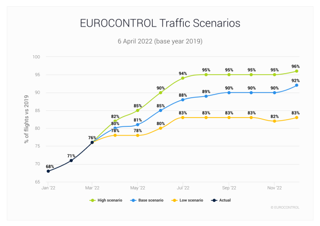 Gli ultimi scenari di traffico EUROCONTROL per il periodo da aprile a dicembre 2022 prevedono una crescita costante tra aprile e il picco estivo, raggiungendo l’89% del traffico del 2019 entro agosto nel nostro scenario di base, con questo livello in leggero aumento per finire l’anno al 92%.